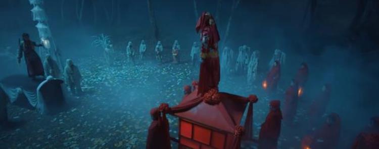 后来在出殡途中果然不顺利,碰到了出殡与接亲相遇的罕见场景,在这里真的要强调,当红艳艳的送亲队伍,与阴森森的送葬队伍交织一起后,有着足够分量的的诡异氛围,光靠画面就能给观众冲击力。