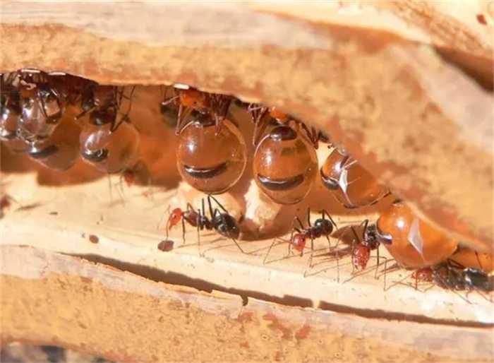 深棕色,表明食物糖分比较高,浅棕色,表明水分含量高,有研究表明有的蜜罐蚁只用来储存水分;