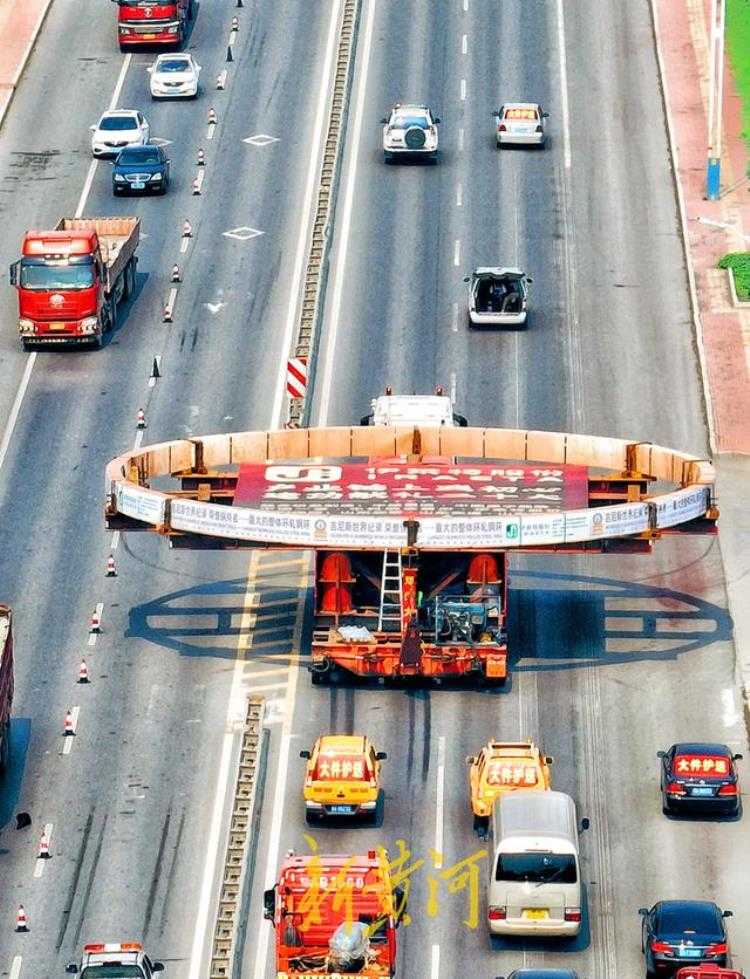 据了解, “乾坤圈”属于“不可解体”的特种大件,如此巨大的环件,在309国道占据4.5个车道,下周二上济青高速后,将占据4个车道。
