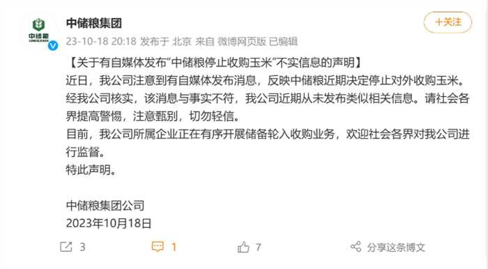 10月18日,中储粮集团公司发布一条通告信息,公司于近日注意到有自媒体发布消息,反映中储粮决定停止收购玉米,经过公司的核实,该消息与事实情况不符,我公司最近并没有发布过类似的信息,希望社会各界能够提高警惕性,注意甄别事情的原委,千万不要轻易相信这些虚假言论,目前,公司的所属企业正在有序开展储备收购业务,也欢迎社会各界人员对我公司进行监督。