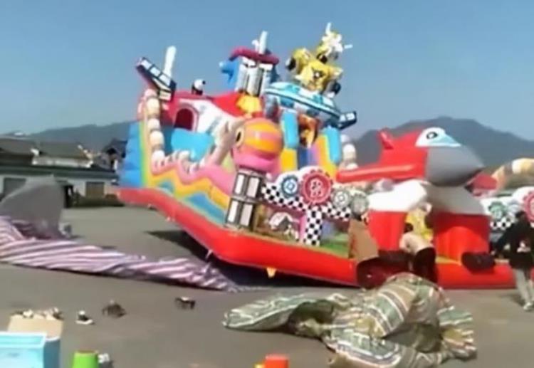 湖北咸宁一景区外充气城堡被掀翻 多人被吹倒在地