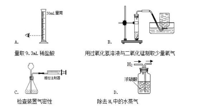 3.下列装置所示的实验中,能达到实验目的是( )A. B. 量取9.3mL稀盐酸 用过氧化氢溶液与二氧化锰制取少量氧气C. D. 检查装置气密性 除去H2中的水蒸气