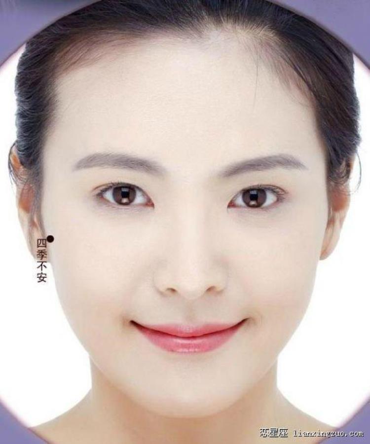 四季不安痣:四季不安意指不安心、安定,心情郁闷,烦躁不安,长有四季不安痣的女子多数情绪不稳。