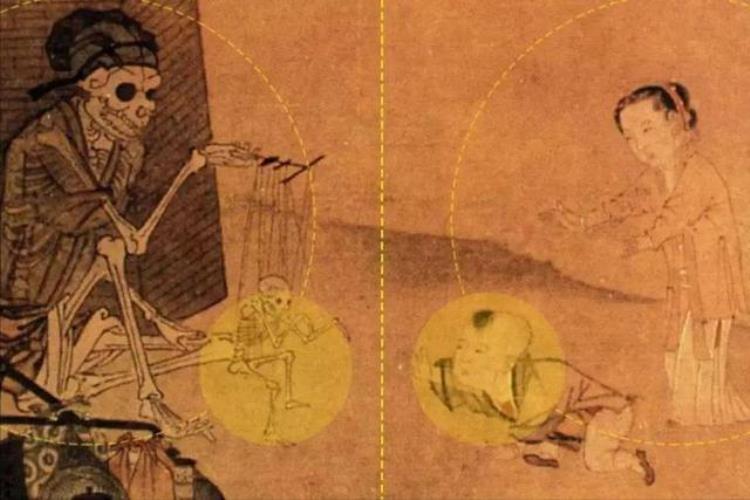 如果我们深究一下李嵩的思想,会发现他深受李从训的影响,对于释道之画两人都颇为精通,于是就有一些人认为,这幅画的核心主体并不是表演提线木偶戏,而是在诠释道家的生死转化和佛家的因果轮回。