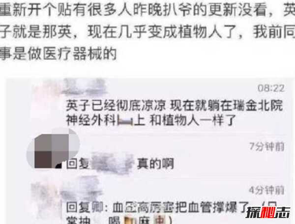 英子?就是那英吗?不少网友疑惑道,爆料的网友又重新解释了一遍:我之前的同事是做医疗器械的,上面英子指的就是那英,现在躺在病床上,被确诊为植物人了。