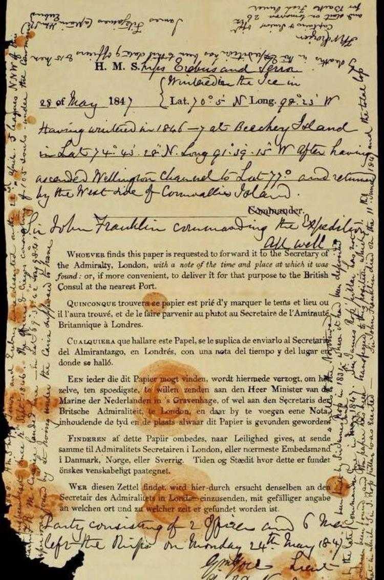 此后又过了5年,搜索队才在威廉王岛一处石堆中找到舰队副指挥的一份文件,这份文件极为重要,上面记录了船队最后一段时光的部分历程,截止日期是1848年4月,按舰队1845年5月出发时间计算,整个远征舰队从启航到最终全军覆没一共经历了大约3年的时间。