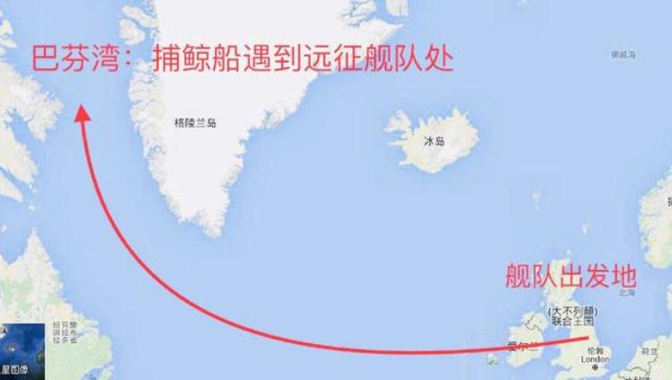 舰队出发后到达巴芬湾航线,箭头所指为遇到捕鲸船处