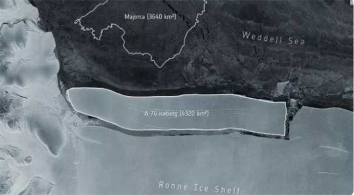 A-76冰山在南极洲海域自由漂流了将近148天,然后分裂成三座冰山,分别命名为A-76a、A-76b和A-76c。其中,A-76a是最大的一块,继承了A-76冰山的绝大部分体积,达到135公里长、26公里宽,总面积超过3000平方公里。