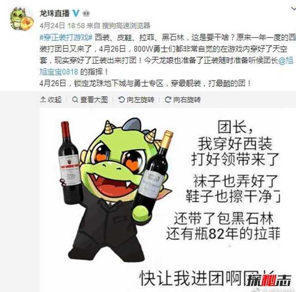 清一色西服上阵。众多玩家纷纷效仿。把群公告全都改成了明天打团,穿西服来!