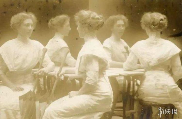 类似于上面,1905年拍摄于英格兰。几名女子盯着对方,其实是利用角度不同的镜子。当时这样简单的技巧欺骗了很多人。