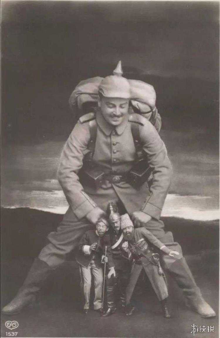 1914年的明信片,德国士兵下方站着法国、英国和俄罗斯士兵。其实这是使用多张图片完成,是将较小的图片切割并放在较大的图片上。