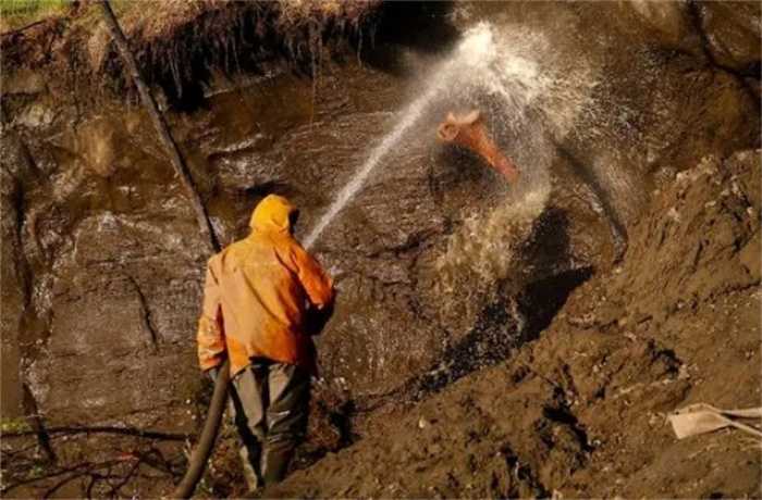 为了合法获取猛犸象牙,淘牙者们采用高压水枪冲刷,加速冰层融化,来寻找猛犸象遗体。有时候为了扩大挖掘地址,还会用水枪冲出隧道,深入挖掘,最深的可达60米。满目疮痍的山体结构,很容易坍塌。