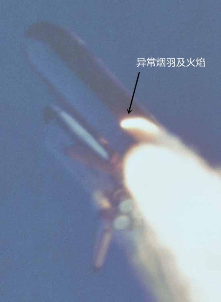 挑战者号发射升空后的58.788秒后,一台追踪摄像机捕捉到了右侧固体燃料推进器靠近尾部支架处喷出了额外的烟羽,因为低温此处的一个O型密封圈失效了,可燃气体从这个接缝处开始泄露出来,并导致原本1毫米左右的接缝撕裂成了一个裂缝,从裂缝喷出的火焰冲击着外部舱。