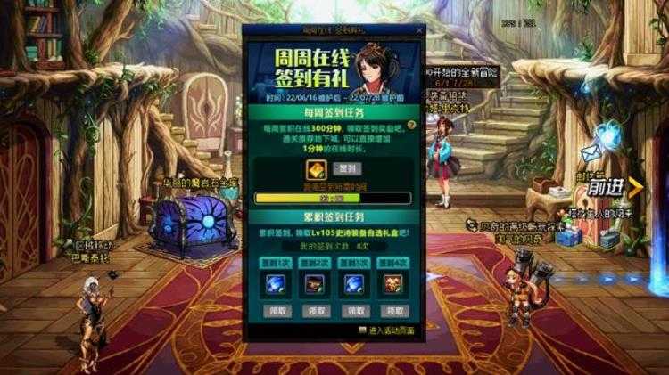 每周在线300分钟,通关推荐地下城可以增加1分钟时长,即可成功签到,签到送50个金绿柱石,累积签到1次送200个先兆水晶,2次送贵族机要和寂静城普通级门票,3次送200个先兆水晶,4次送105级自选的史诗装备。