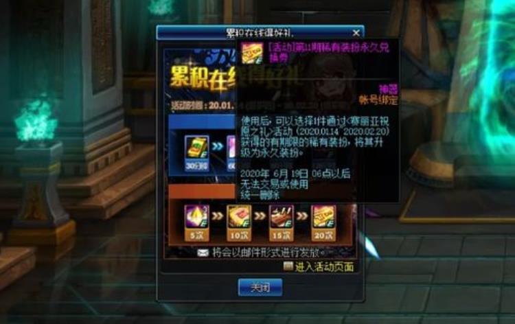 第一个,累计在线活动,只要累计在线2个小时,坚持20天就能获得一张稀有装扮永久兑换券,使用后可以将获得的8件天空中的1件进行升级永久。