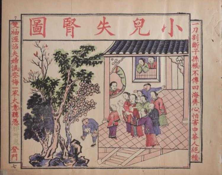 种种谣言的集大成者,当属一名叫周汉的文人编写刻印的《谨遵圣谕辟邪全图》,图文并茂地描绘了各种洋人剖腹刳胎、剜眼割肾之类的谣言。其中仅《鬼教该死》在湖南便印了80万册,利用善堂作为发行机构,遍及全国,成功地系统性地煽动民众对西方势力的恐惧和仇恨。其中一幅便是《小儿失肾图》,画面中,一个婴孩被全家人抱着,他的下体血迹淋漓,已经被洋人盗走了外肾。而这幅画可以说是中国版盗肾传说最形象的来源。而萦绕着《小儿失肾图》而形成的一种集体心态,则在之后的一个多世纪中,塑造了中国版盗肾传说的特质。