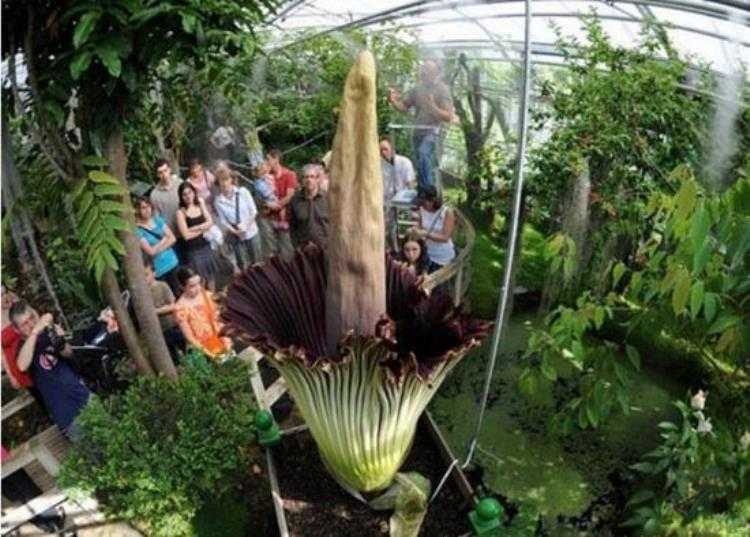 泰坦魔芋花(Titan Arum),又称为“尸花”,它还有更形象的一个名字“尸臭魔芋”。此花生长于苏门答腊群岛,花龄为150年左右,成花预计可以高达1.8米左右,是世界上体型最大的花,刺鼻的气味是从它的花冠释放出的,花冠成熟时臭气最浓,臭气吸引来的大量苍蝇和甲壳虫则帮助它传播花粉,同时散发出的尸臭味也会急剧增加。当花朵凋落后,这株植物就又一次进入了休眠期。而它散发出的像臭袜子或是腐烂尸体的味道,是想吸引苍蝇和以吃腐肉为生的甲虫前来授粉。它非常艳丽,比你能想象到的任何东西都要美,然而这种美得出奇的花朵确实是生长在我们这个星球上的,依然还有存在于世界之中。