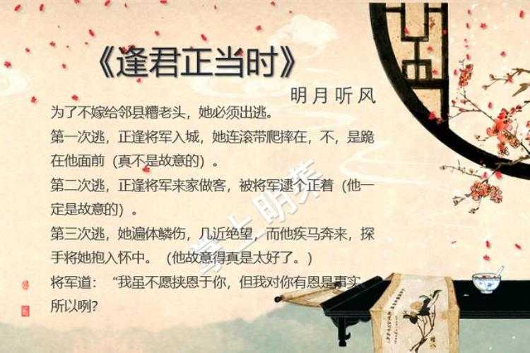 《逢君正当时》安若晨不想听从她爹的安排嫁给隔壁县年过花甲的钱老爷做填房,屡次逃家,结果都遇上了龙将军。第一次逃,她灰头土脸滚到了将军脚下“小女子历尽周折,才能赶来此处见将军一面。如今得偿所愿,再无遗憾”。第二次逃,被来家赴宴的龙将军逮个正着“难道这婚事会比逃家的后果还可怕?”。第三次逃,她遍体鳞伤,几近绝望,而他疾马奔来,弯腰探手将她抱入怀中。逃跑未成功却卷入了细作的阴谋之中,她成为了破解谜团的关键,也成了他心中的重中之重……