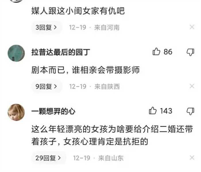 网友评论说这个女孩长得很漂亮,在未来一定会有更多优秀的人和他在一起,而不是嫁给一个已经离婚带娃的中年男人。另外也有网友说这可能只是一个剧本,毕竟也没有见过谁相亲的时候还会带上一个摄影师。不管怎么说,还是希望这样离谱的相亲事件能够不要真实发生。