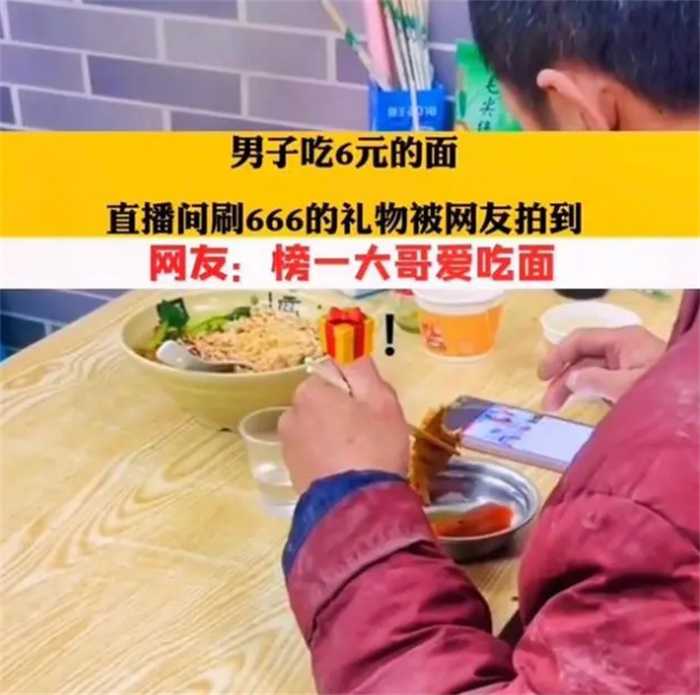 这个榜一大哥在直播间里非常豪气的刷了一个666元的礼物,女主播自然而然也是甜甜的,感谢大哥,但是这个榜一大哥只是一个穿着破旧羽绒服的普通男人,看样子应该是一个收入不高的农民工,而他自己吃的则是6块钱一碗的素面。