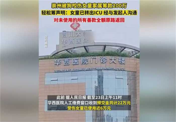 10月25日晚7点轻松筹官方微博发布退款说明,称成都被狗咬伤女童转出ICU,情况稳定,经与发起人沟通,将未使用的所有善款全额原路退回,这一消息引起了人们的关注。