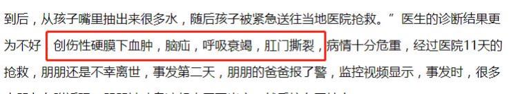而且这位孩子受伤确实是非常严重的,什么头皮血肿,肺水肿,还有肛门撕裂伤等等,这样这些词语可能都比较专业,但是听到这些字眼,我觉得都能够感受到孩子当时是遭到了多么激烈的冲击力。