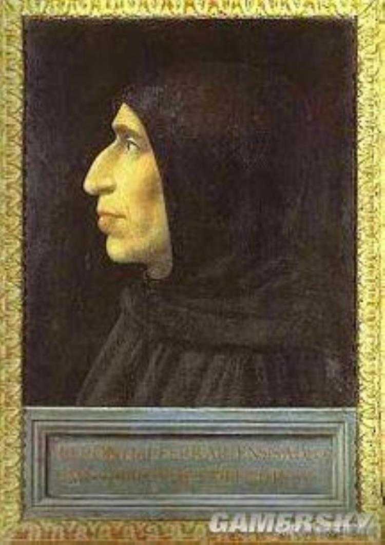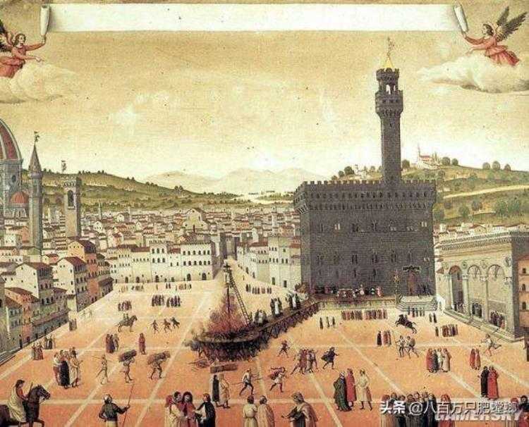 最后萨沃纳罗拉因施政严苛而被佛罗伦萨的市民推翻,以火刑处死。就在萨沃纳罗拉当初点燃“虚荣之火”的地方,他自己也被烧成灰烬。他死后不久,美第奇家族再次掌权。艾吉奥的演讲 艾吉奥杀死萨沃纳罗拉后站在广场上,对佛罗伦萨的民众发表了一番演讲,鼓励他们独立思考,不要追随他人,听信谣言,迷失自我。之后,他和其他刺客离开了佛罗伦萨,回到蒙特里久尼研究金苹果的秘密。