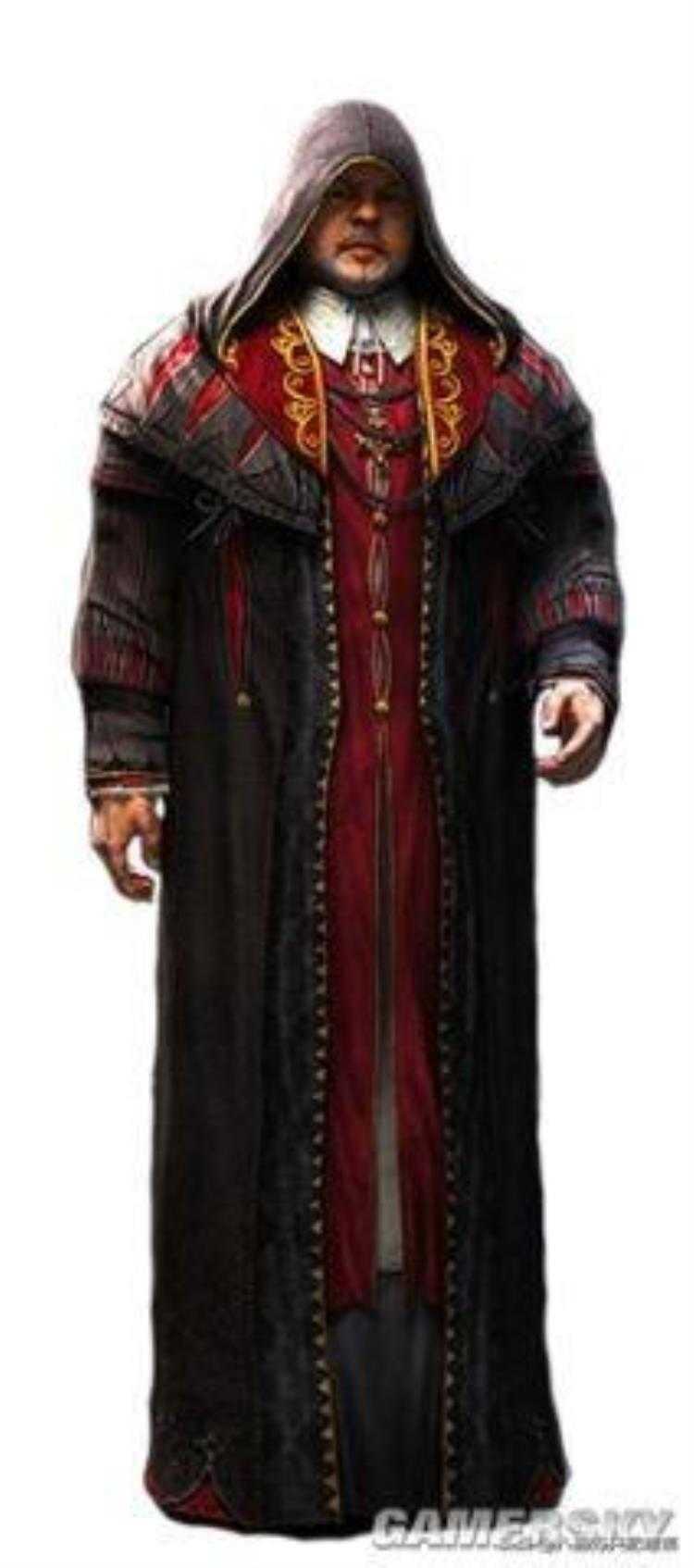 罗德里戈·波吉亚(Rodrigo Borgia,1431-1503)是一名出生于西班牙的红衣主教,圣殿骑士的首领,也被称为“那个西班牙人”,他还是《兄弟会》大BOSS西泽尔·波吉亚的父亲。 他于1492年至1503年担任罗马教皇,被称作亚历山大六世。他是文艺复兴时期最富争论性的教皇之一,他的家族也成为了那个时期教廷腐败的代名词。