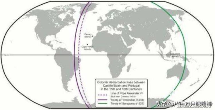 1494年西、葡两国签订了《托尔德西里亚斯条约》(Treaty of Tordesillas),将分界线再向西移270里格,巴西即根据这个条约被划入葡萄牙的势力范围。这条由教皇作保规定的西、葡两国同意的分界线,开近代殖民列强瓜分世界、划分势力范围之先河。