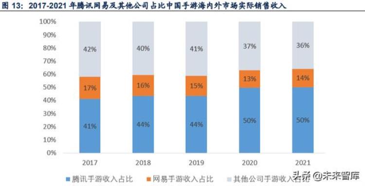 腾网手游收入占中国游戏海内外收入达 64%,腾讯已超 50%。2021 年,中国移动游戏市 场实际销售收入 2255 亿元,中国手游海外市场实际销售收入 161 亿美元(约 1025 亿元), 合计约 3280 亿元,腾讯海内外手游业务收入 1648 亿元,占比超过 50%,网易海内外手 游业务收入 443 亿元,占比超过 14%,其他公司合计 36%。