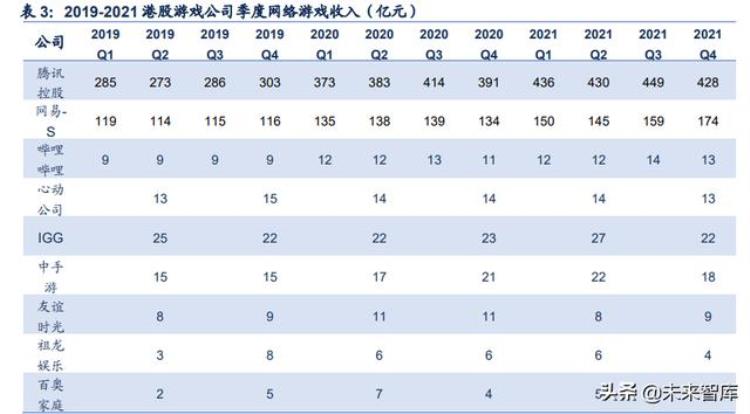 全年总体营收增速放缓,增长来源于腾讯、网易经典旗舰游戏及新锐游戏表现。2017- 2021 年港股网络游戏收入稳步增长,2021 年实现营收 2572 亿元,同比增速为 11.24%, 同比减少 18pcts。其增长主要源于腾讯、网易游戏业务分别同比增长了 12%和 15%。腾 讯游戏业务增长得益于《王者荣耀》、《使命召唤手游》、《PUBG Mobile》及《Valorant》 海内外表现,网易游戏业务增长得益于热门新款手游《永劫无间》、《哈利波特:魔法觉醒》 热门新款游戏及经典旗舰产品《梦幻西游》、《大话西游》。哔哩哔哩、IGG、中手游同比略 有增长,心动、祖龙娱乐、百奥家庭互动、友谊时光均略有下降。
