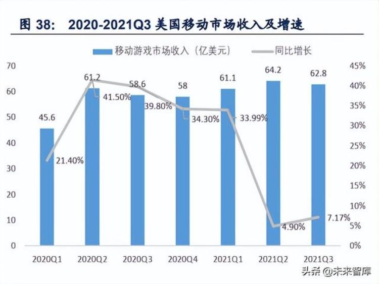 疫情后时代未见回落,美国手游市场连续三季度超过 60 亿美元。2020Q2 至 2021Q1 期间, 在疫情影响下,美国手游市场收入同比增长均达到 30%以上。随后,虽疫情进一步得到缓 解,但美国移动游戏市场收入并未出现回落。2021Q3,美国手游市场应用内购收入同比增 长 7%至 62.8 亿美元,已连续三个季度收入超过 60 亿美元。
