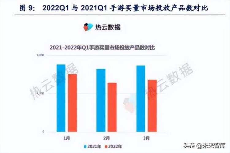 在游戏版号受限、广告主预算普遍下降、营销方式多元化等多重因素作用下,手游买量市 场呈现出疲软态势。根据热云数据 C.A.S 广告素材智能分析系统数据,2022 年 Q1 月均投 放产品数超过 6200 款,同比下降近 20%,App 数量减少近 1500 款。在春节档新游的带 动之下,22Q1 的新增率较 21Q4 相比有所提升,但与去年同期相比,仍处在下行发展阶段, 平均新增率约 15%,低于去年 4 个 pcts,增量市场表现乏力。