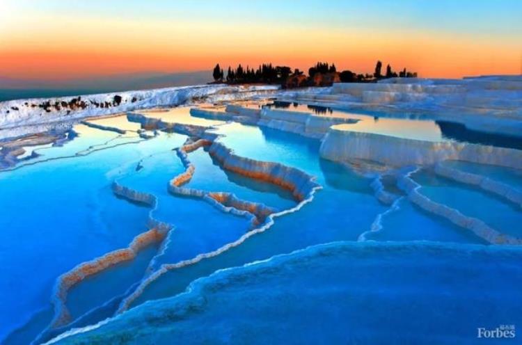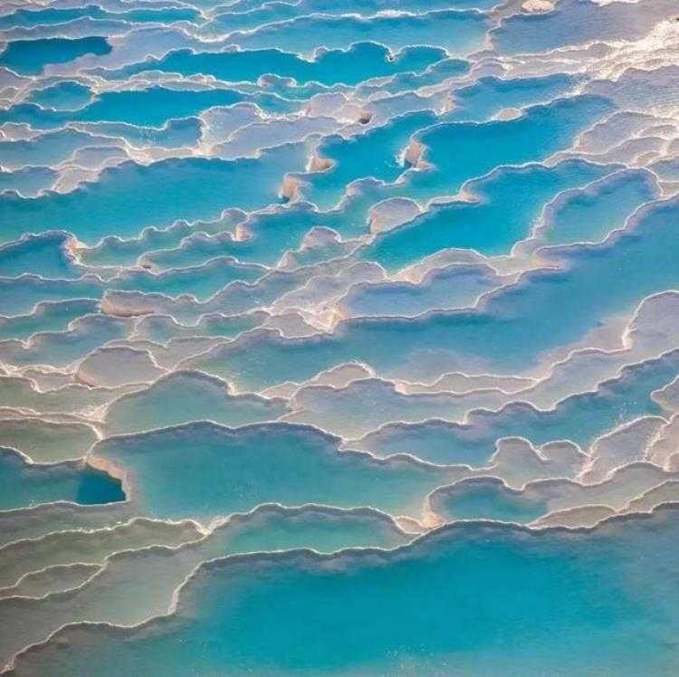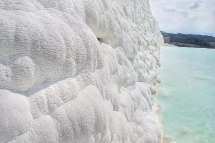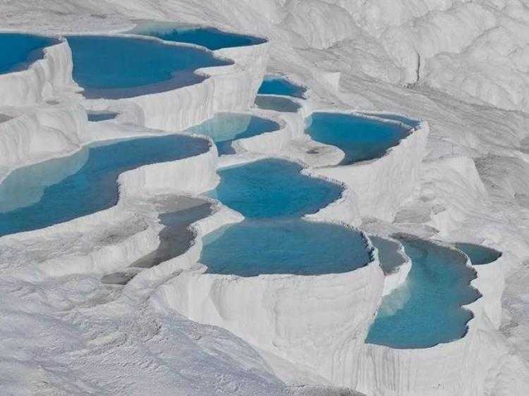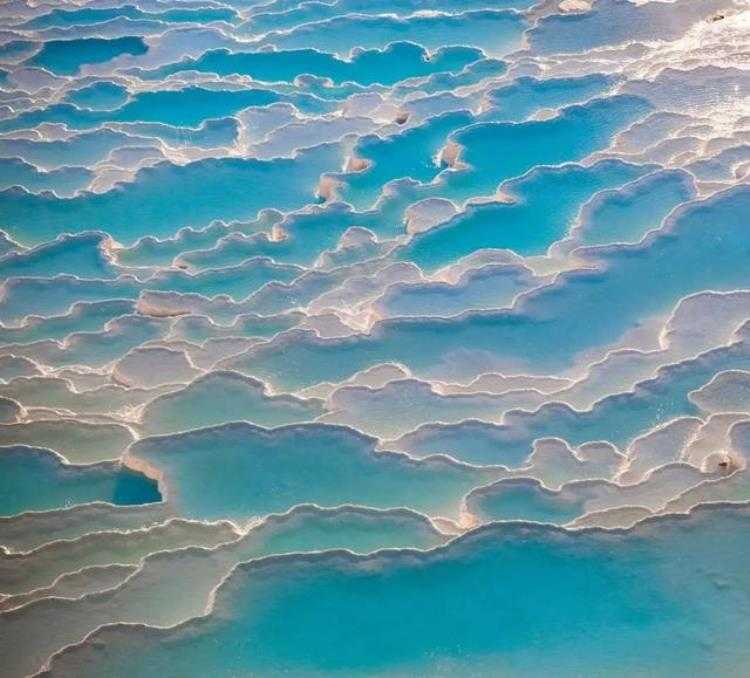 位于土耳其,远远望去,它像冰川,但是实际上这里却是许多温泉,它真实的地质形态是白色石灰石呈梯田状分布。当地的雨水渗入地下,经过漫长的循环又以温泉形式涌出,在此过程中溶解了大量岩石中的石灰质和其他矿物质。当温泉顺山坡流淌时,石灰质沿途沉积,久而久之便形成一片片阶梯状的钙化堤。