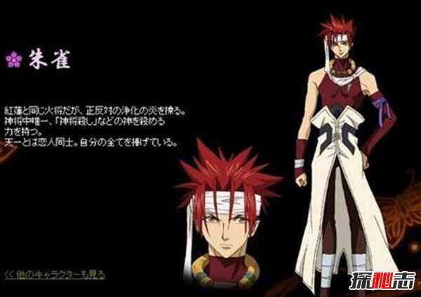 十二神将之火将,凶将,个性爽朗,但一牵扯到天一就会失去理智,使用巨大的剑斩杀敌人,相对于腾蛇那烧尽一切的地狱业火,朱雀的火焰则是拥有净化之力的净化之炎。是十二神将里唯一可以斩杀同胞的神将,额头上绑的领巾是天一的东西。与天一是恋人,为了她可以把自己的一切都奉上。跟上一代天一是好友,亦是唯一知道上一代的天一身亡内幕的神将。继天空之后,第八位服从于安倍晴明的十二神将。