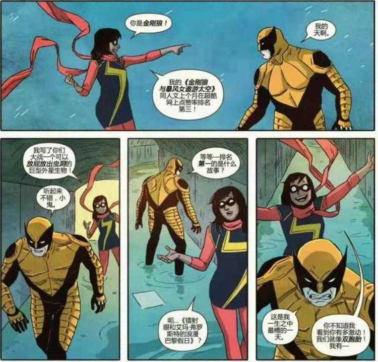 漫画中,卡玛拉同样热衷于创作复联成员的同人文,其笔下《镭射眼与白皇后的巴黎浪漫假日》还曾位列同人网站点击量第一名。为迎合当下潮流,同人文梗在剧中化作二创同人视频。