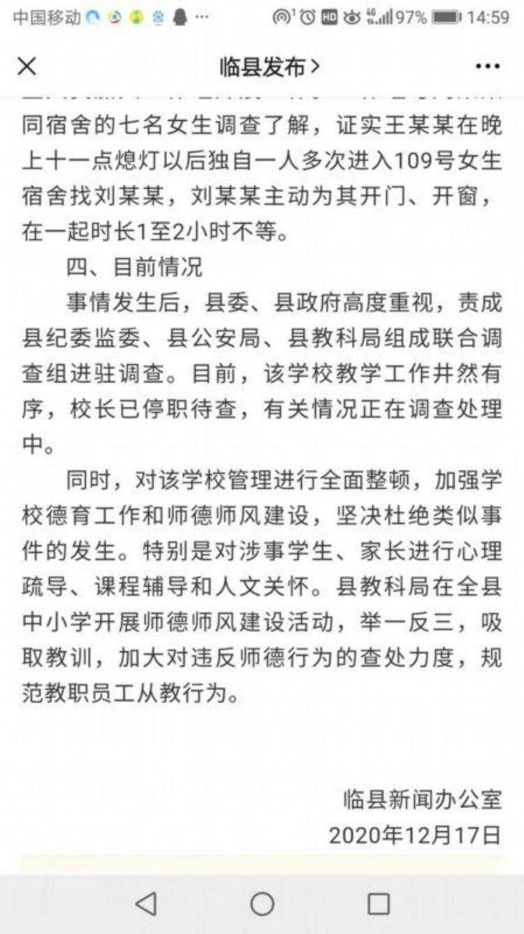 据官方通告称,因为这位学生的班主任给校长反映了该学生有早恋的情况,校长组织教导主任等人调查,发现这位学生喜欢在晚上11点左右主动开门让男生进自己的宿舍。后来校长叫这位学生来到办公室核对情况,一开始学生并不说实话,校长也没控制好自己的情绪就拿起笔杆打了女生的臀部,并且要求该女生写检讨。