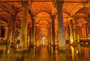 这里原是6世纪拜占庭时期因战争原因而建的贮水池。据史料记载,地下水宫殿是公元542年,朱斯提尼安大帝动用七千名奴隶在教堂废墟上建成的,一方面为的是保证宫廷用水供给,一方面是防止敌人围困,有备无患。水宫殿储水量达10万吨之多,如果蓄满了水,据说可供当时全城人喝一个月。