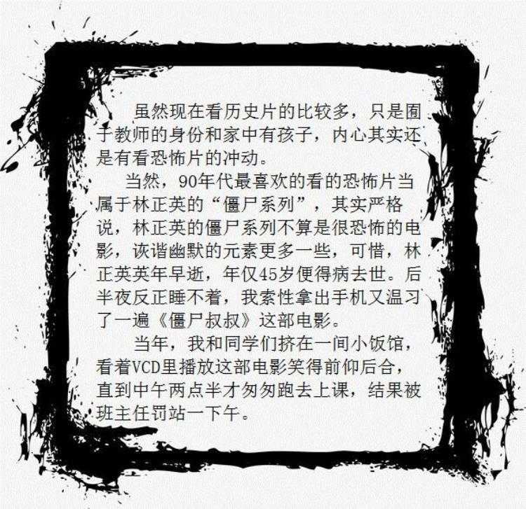 有些事看着看着就明白了,有些人看着看着就看丢了,看着看着我们就告别了青春,看着看着我们的泪水已然落下,我和世界都在变化,唯有林正英和他的僵尸家族还定格那个最好的年华,致敬随风而逝的青春风华。