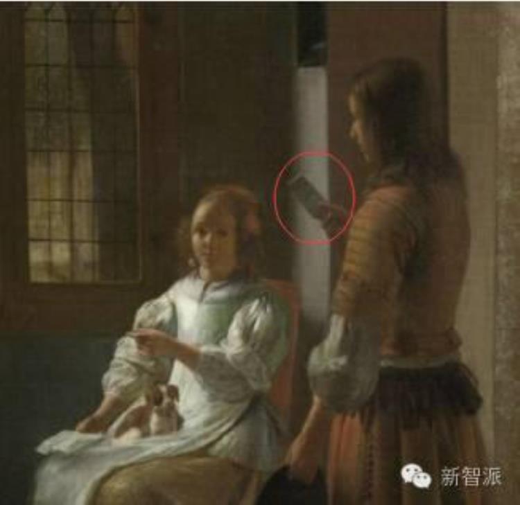 是不是看起来很诡异?这幅油画描写了一个家庭,有访客进入,粗看的话会觉得并没有什么不同之处,但是仔细看,右边的那个女人手里拿着一个类似现在手机的东西,并且在看着它的屏幕。
