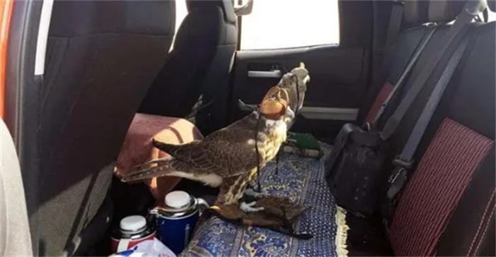 看见猎物后,坐在SUV车后座上的驭鹰人,准备释放它的猎鹰。
