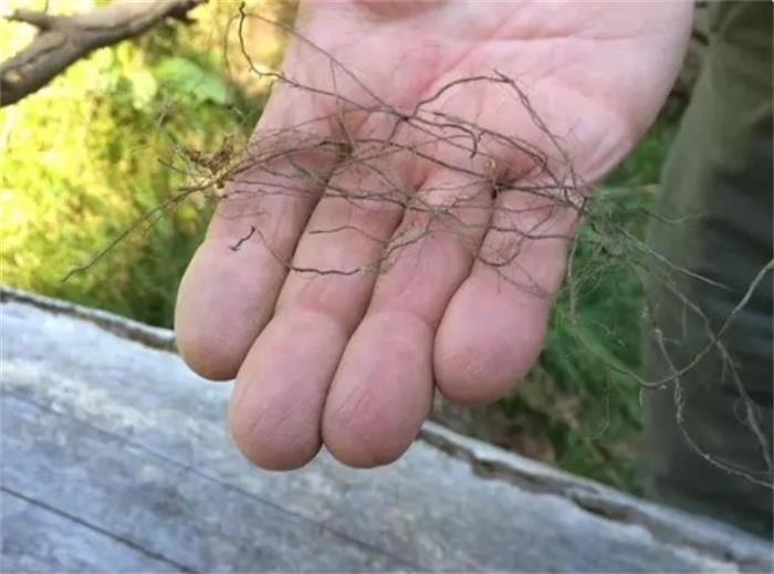 这些蘑菇通过黑色的菌丝相连,这些菌丝和开头提到的黑色丝状体相似,埋伏在地底下,最深的可达3米深,牢牢扒着树木的根系,从树木上吸取营养,那些蘑菇就是在树木的滋养下长出来的。