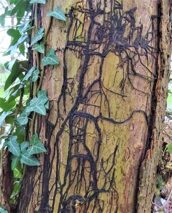 所到之处,树木均被其寄生,科学家用斧头破开树木根部,再用手指拨开树皮,就能发现有很多类似“乳胶漆”一样的真菌菌丝,这些菌丝的颜色会随着时间变深变黑。有时,黑色的菌丝体会蔓延至土壤上的树干。