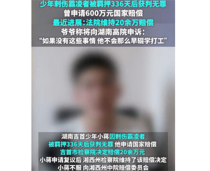 11月19日消息,湖南吉首少年小蒋,由于刺伤霸凌者被公安机关羁押336天后获判无罪,小蒋和他的家人于是便申请国家赔偿,吉首市检察院决定赔偿小蒋20多万元,拿到这个结果小蒋和家人并不认同,小蒋申请复议之后,湘西州检察院维持了一审原判,小蒋不服该判决,于是向湘西州中院赔偿委员会作出了赔偿决定,也正是在最近该法院作出赔偿决定,该院作出赔偿决定,仍持此前20多万钱的元的赔偿金额。