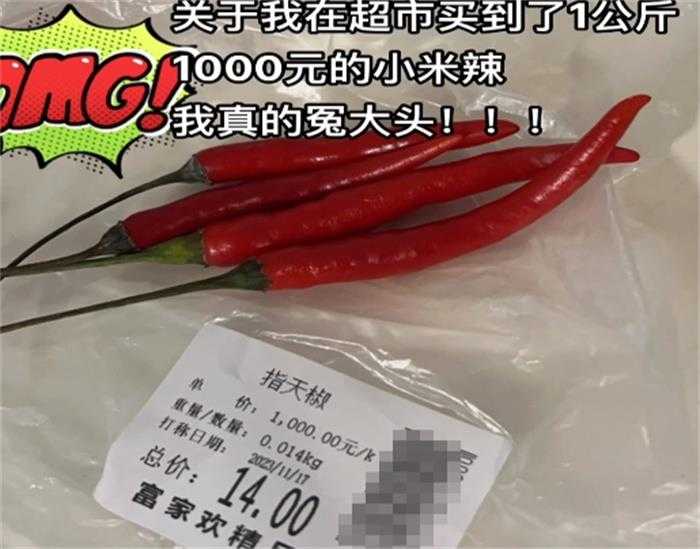 女子发布的照片显示商品价格为朝天椒,单价每千克1000元,购买了0.014kg,总价为14元。此事一经播出,涉事超市立马回应称是价格打错了,目前已经纠正过来了,而事后深圳12315的热线工作人员告诉记者,相关部门会继续前往超市核实相关情况。但这件事情愈演愈烈,所有人对超市的相关系统产生质疑,即使价格有一定的误差,但也不应该误差如此之大。