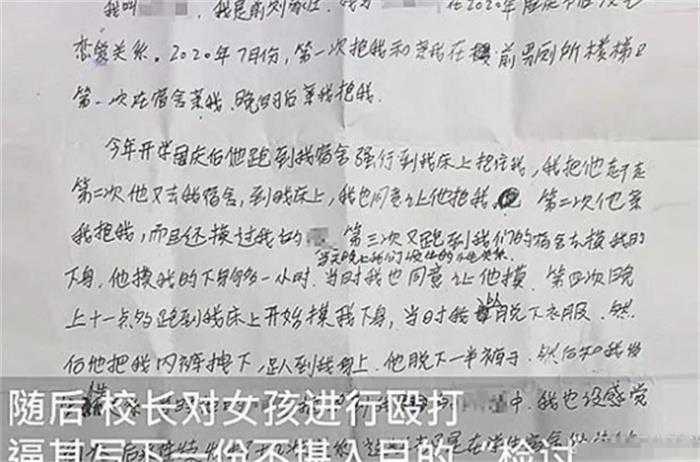 嚣张的校长强迫女孩写检讨书并殴打。在今年的年初,山西某县城发生了一件骇人听闻的事情。一个13岁的女初中生在深夜里被校长叫到办公室,而校长这么做是因为怀疑女学生早恋,并且逼迫这个女生写下了一份检讨书,甚至在逼迫女生的时候,还用铁棍对女生进行殴打。