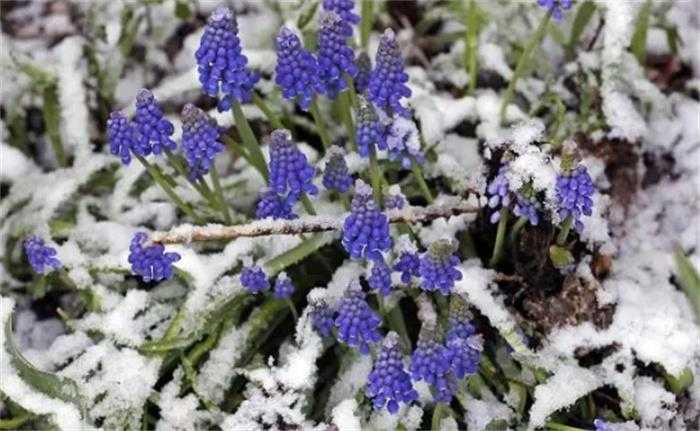 2019年4月27日,芝加哥郊区拍摄到被雪覆盖的风信子,一场罕见的冬末风暴引起了芝加哥地区的暴雪。
