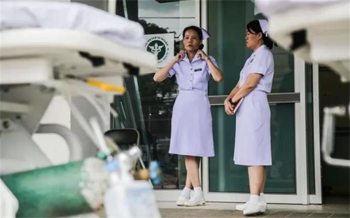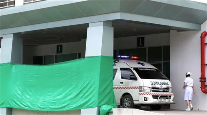 一个护士走过救护的Chiangrai Prachanukroh医院的一辆救护车。