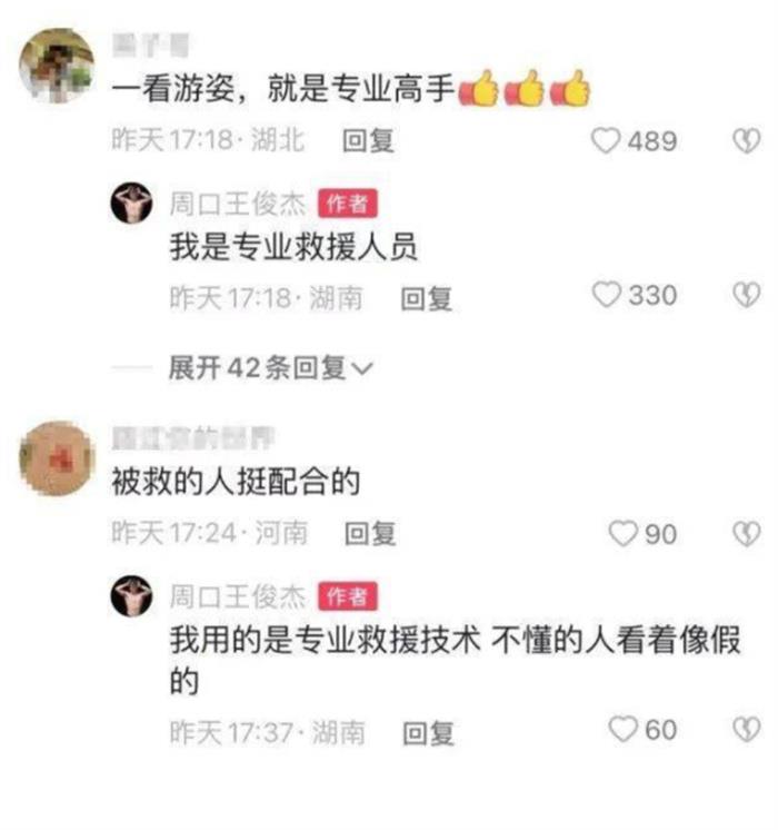 不少的网友都对王先生下水救人的事迹点赞,并且还有不少网友表示,看王先生游泳的姿势就知道是一个专业的高手,王先生并没有客气直截了当的说自己是专业的救援人员,但是在很多人点赞支持和鼓励王先生的时候,居然还有不少的网友提出质疑。他们认为被救的人是否太过于配合了一些,很像是在演练或者是在拍段子总之是说王先生救人不过是摆拍而已。