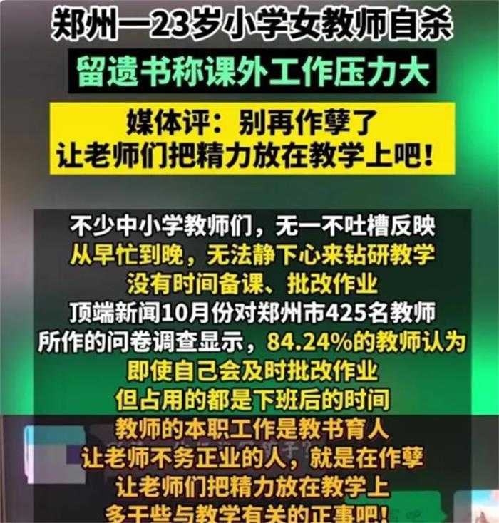 23岁女教师因为学校的形式主义被逼到跳楼。女教师吕某在编,并且在某学校里面担任了语文老师,在随后还被学校任命为了班主任,这对于一个刚刚进入到学校成为老师的新人,教师来说是一个比较大的挑战。可能有不少的同学都觉得班主任老师的工作也不过就是管理一下班级,然后教好自己的课程就行,但实际上班主任老师要做的并不只有这些。